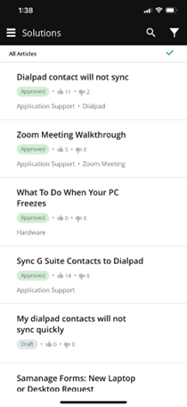 The Service Desk Solutions module in the mobile application provides knowledge articles that contain solutions used by your organization in resolving incidents. In the Solutions module you can see a list of all articles and their status.