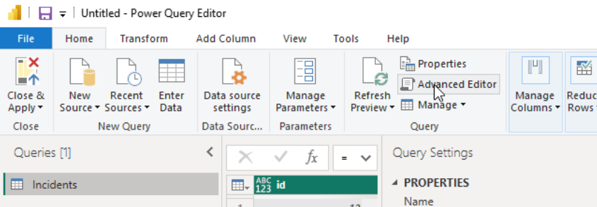 In Power Query Editor select the Incidents query, then navigate to Home > Advanced Editor.