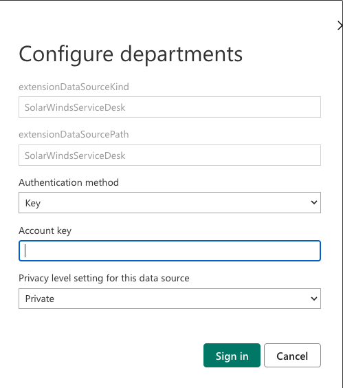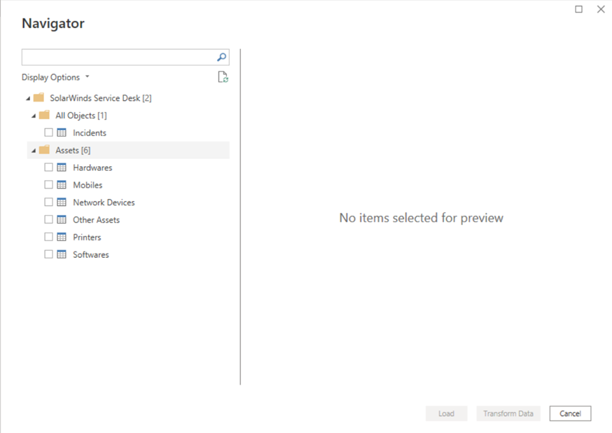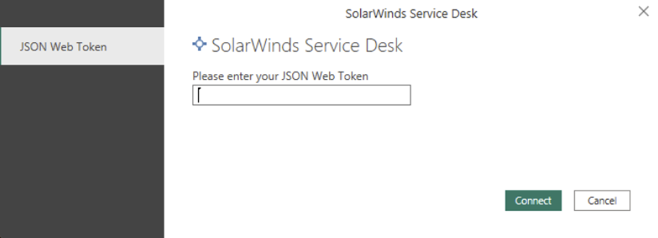 In Power BI Desktop, select Get Data from Home. Select SolarWinds Service Desk, and then select Connect.