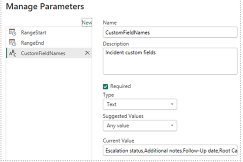 RangeEndand larger than and equalsRangeStart.Set enough time between the parameters to allow you to pull sufficient records for your reports, but not too large. Select a range that won't cause you to wait a long time for every refresh. See Microsoft's instructions: create-parameters.Example