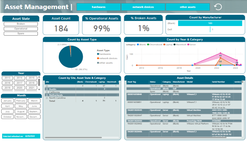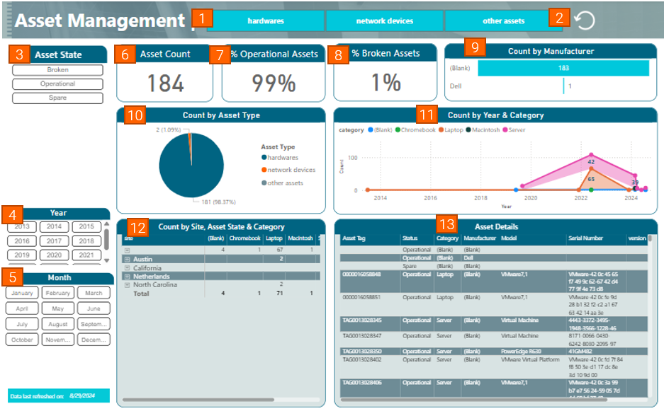 This section displays a high-level summary of all assets, including key information such as their asset status, asset tag, category, owner, and other related information. It can be filtered by their asset status and year or month created.