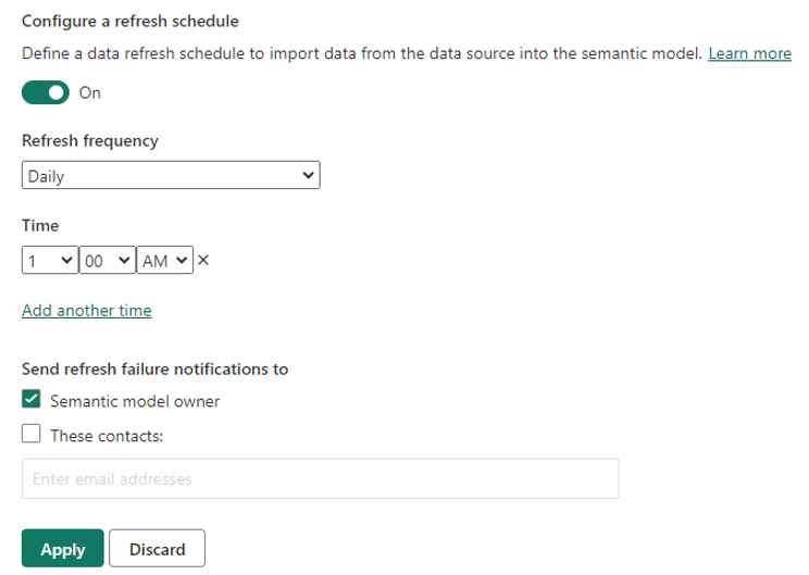 Click Configure a refresh schedule, and then configure the timing of your refresh (for example, time zone and time) and the recipients of refresh failure notifications.