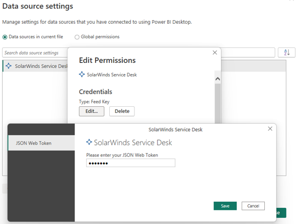 Input your JSON web token generated from Service Desk by clicking on data source SolarWinds Service Desk > Edit Permissions > Credentials > Edit.