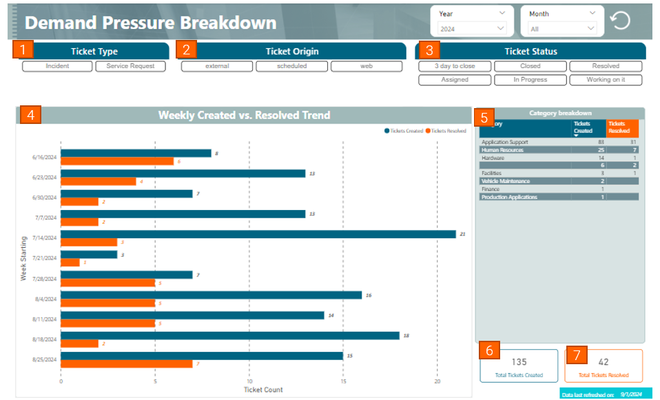 | 4 | Clustered bar chart | Tickets created vs. tickets resolved by week |