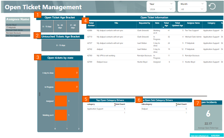 This section displays a comprehensive list of open tickets, including key details such as ticket number, status, updates, priority, and assigned team members. It can be filtered by length of time since the ticket was created or updated.