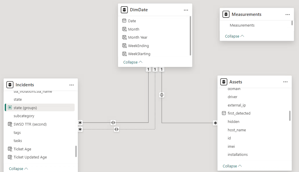 | DimDate | Date dimension table to connect all other tables (Incidents, Assets) | DimDate = CALENDARAUTO() |