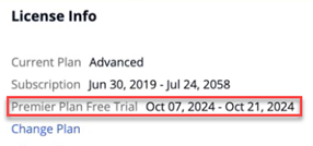 Account owners and administrators can see the dates of the Premier trial period in three locations: