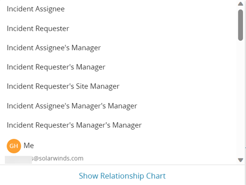 Select either Incident Assignee or Incident Requester. Your selection identifies the starting point of the relationship chart. If you select Incident Assignee, you will see relationships related to the assignee. If you choose requester, you will see relationships related to the requester.