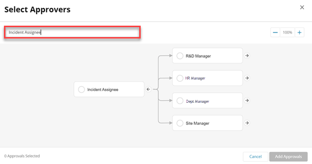 You can also expand and contract the chart by clicking the arrow next to an approver's role. For example, in the image above, the Incident Assignee has four approvers designed to be selected (R&D Manager, HR Manager, Dept Manager, and Site Manager). If you click the arrow to the right of Dept Manager, another level of roles related to the Dept Manager will appear. You can always tell which approver's additional level has been expanded by looking at where the expansion starts. A line connects the original role to the expanded roles.