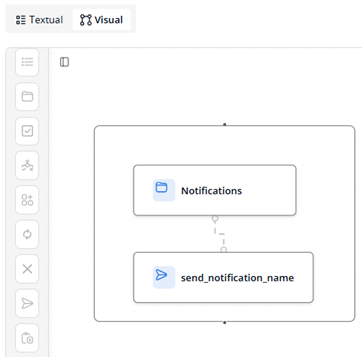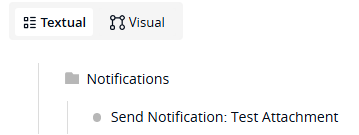 - Click Add to insert workflow steps. Click Textual to see a text representation of the workflow or click Visual to see a visual representation of the workflow.