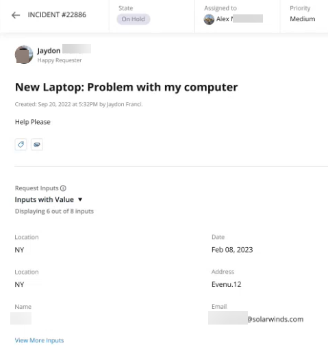 With the introduction of the service request ticket modification feature, the non-editable area may now include all request fields, even those without values. To enhance usability, the default view displays only fields with values. However, you can always filter to view inputs with values or all request inputs as needed. You can also change the default view to display all inputs by going to My account > Setup and then selecting an option: Compact display or Full display.