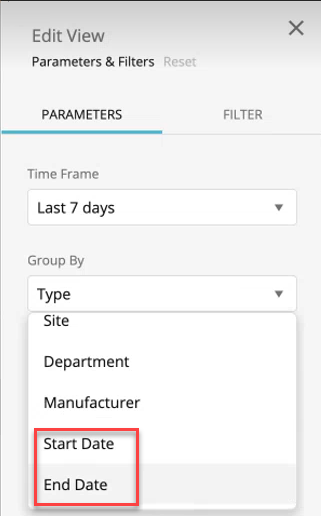 As appropriate, under Group By (and/or Stack By), select Start Date and/or End Date from the dropdown list.
