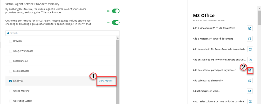 When an organization administrator enables OOTB articles, they are enabled for the entire organization, including all service providers. For them to be available to service-provider customers, the service provider needs to enable the Virtual Agent for customers.