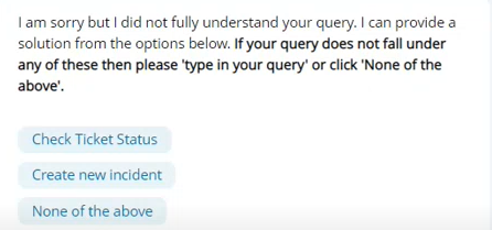 If a user types something into the message bar but the Virtual Agent cannot find a relevant match, it will tell the user it did not understand the query and offer some solutions. For the example below the user typed in Update ticket. The Virtual Agent offered two options (check ticket status and create new incident), but those are not specifically related to Update ticket.