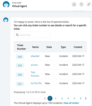 The number of tickets displayed is dependent on the channel through which the user is working, for example, web, mobile app, Slack, or MS Teams. The user can advance through the pages to see tickets that do not display on the first page. The Virtual Agent displays up to 100 tickets on multiple pages. To see more than 100, click View all tickets.