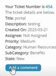 Comments: When the ticket is created Service Desk provides details of the ticket and the option to add a comment. See Add a comment.
