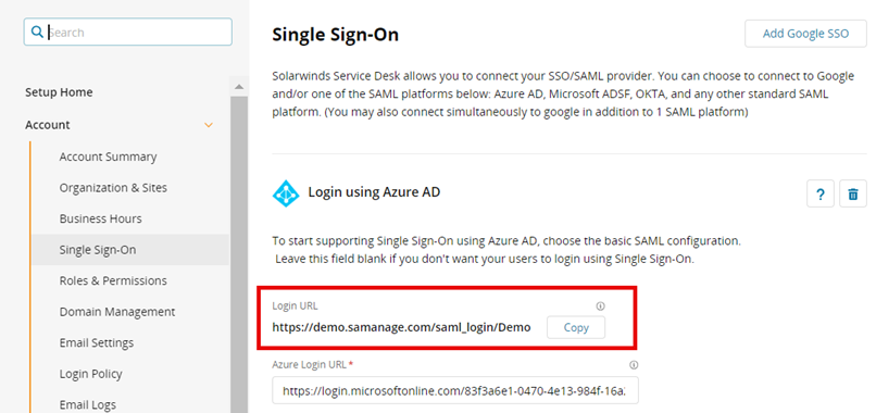 In Service Desk, navigate to Setup > Account > Single Sign On > Azure integration, enter the information below, and then click Update.