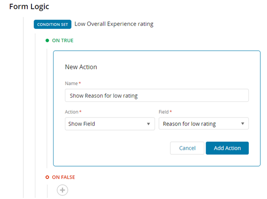 Group all the questions into a single survey custom form. For the example below, create a standard headquarters survey. Use field logic to automatically hide the Reason for low rating field and make it visible only if the user's response to Overall experience is rated as Fair or Poor.