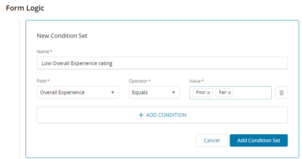 The default survey fields (Satisfied; Dissatisfied; and any survey keyword, phrase, or expression provided in a comment), along with custom fields used in your custom surveys, are available for you to use in conditions. In addition, fields related specifically to satisfaction surveys are labeled to differentiate from fields available for other object types.