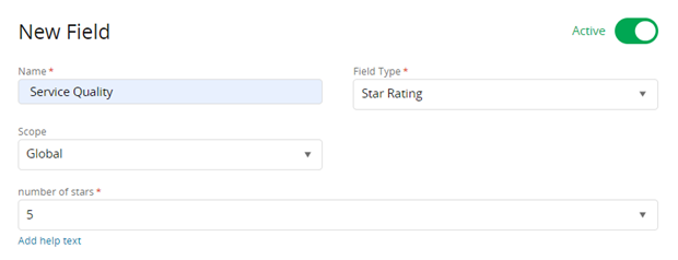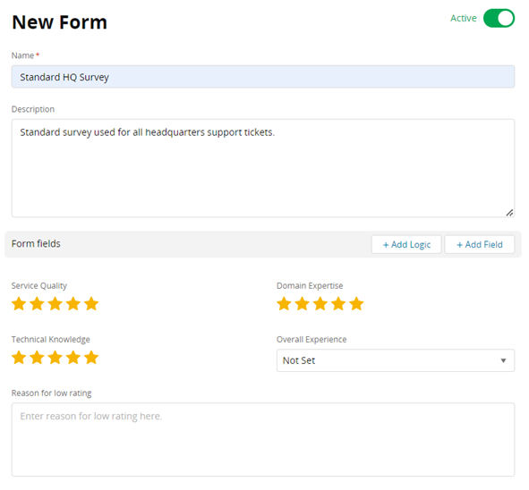 Field name Field type Notes Service Quality Star rating 1-5 stars Domain Expertise Star rating 1-5 stars Technical Knowledge Star rating 1-5 stars Overall experience Dropdown Values: Superior, Excellent, Good, Fair, Poor Reason for low rating Text area Example: