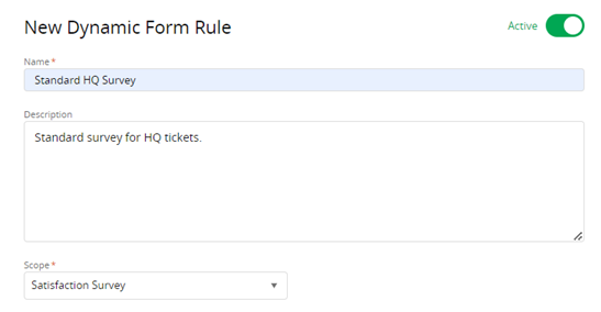 Create a new dynamic form rule to use the survey form for all tickets associated with the headquarters site.