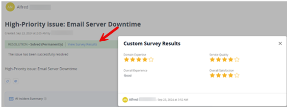 Agents and managers can see survey results from incident tickets. When a requester submits a survey, a link appears in the green resolution bar indicating that survey results are available. Users can click the link to see the results.