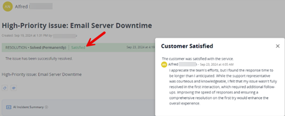 Service Desk comes with a satisfaction survey engine built into the application. After an incident's status changes to Resolved, a customer satisfaction (CSAT) survey can be sent to ticket originators via email to request their feedback.