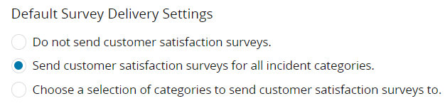 Default survey delivery settings. Decide whether to disable surveys or send them for all incident categories or selected incident categories.
