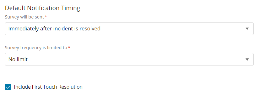 Default Notification Timing. Decide when Service Desk will send surveys, how often it will send them, and whether they should be sent for first touch resolution. You can also decide whether to use an external survey.