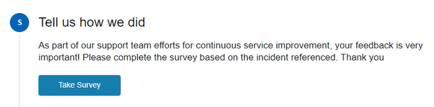 Based on the settings you establish for each survey type, the incident requester receives an email asking that a survey be completed. The requester needs to click a link in the survey to begin providing responses.
