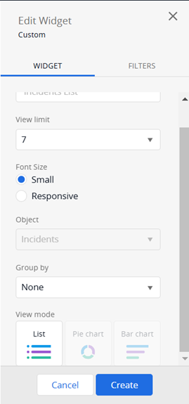 After you've added your filter, return to the Widget tab to select a View results option (List, Pie chart, or Bar chart).