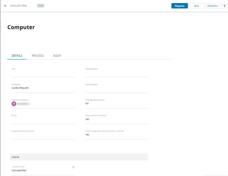 From the Catalog Items index page, locate the catalog item for which you want to test the process workflow. The catalog item must be in a DRAFT state.