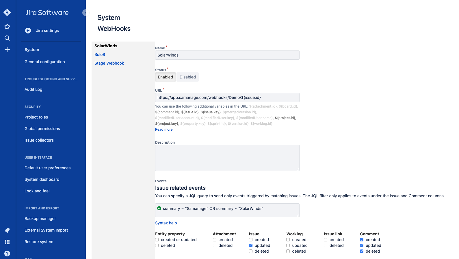 - Events: summary ~ “Samanage” OR summary ~ “SolarWinds”