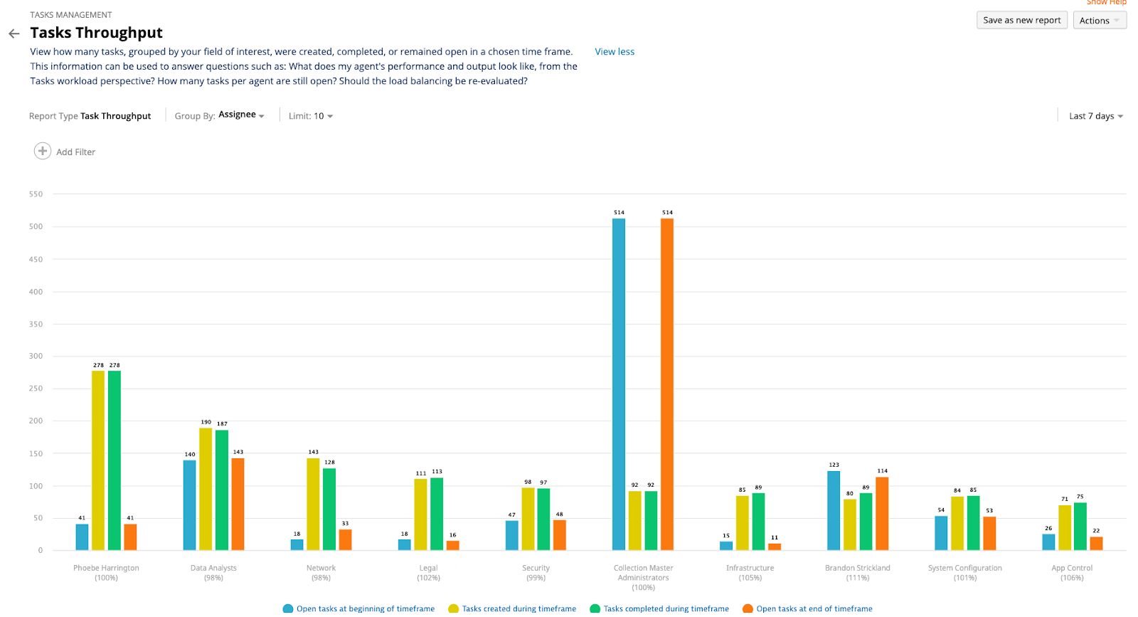 - Tasks Throughput - This report displays how many Tasks (grouped by your field of interest) were created, completed, or remained open in a chosen time frame. This information can be used to answer questions, such as: