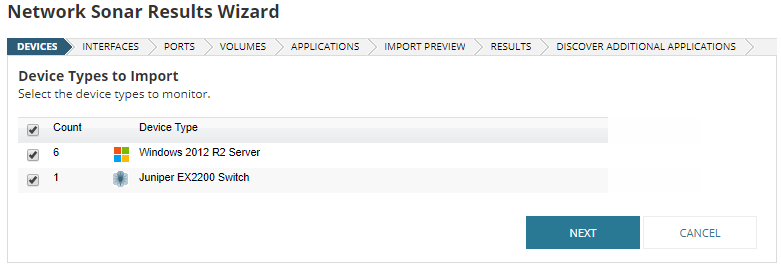 - Ensure only the device types you want to monitor are selected, and click Next.