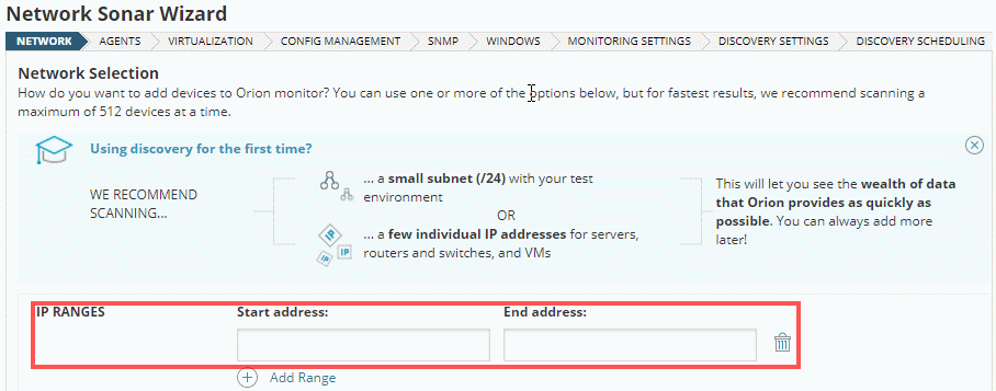 - If this is your first discovery, and you want to start seeing real data as soon as possible, just add a limited range of IP addresses by adding a start and end address.