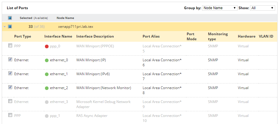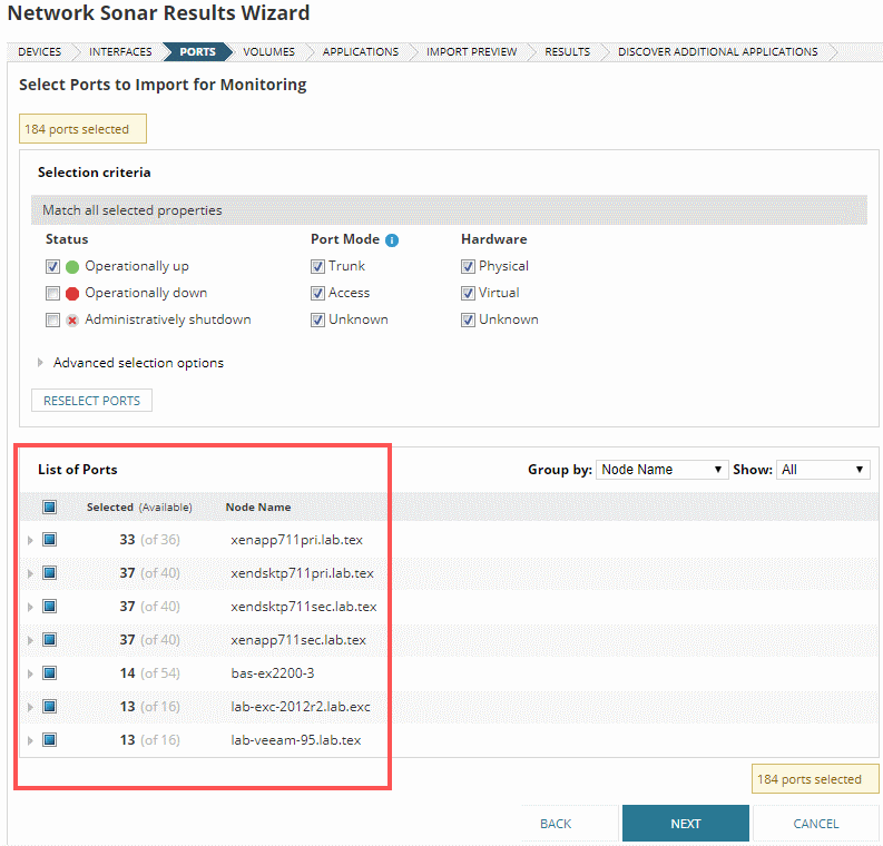 By default only ports with the UP status are selected.