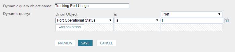 - Click Add Condition and build the following condition using the three drop-down lists: Port Operational Status |is | 1.