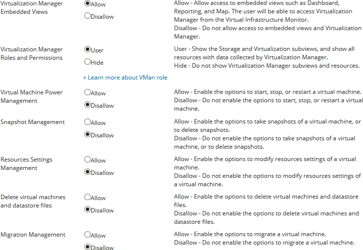 Select an option to allow or disallow users from VM management tools and functions. These permissions provide native tool features through the SolarWinds Platform Web Console.