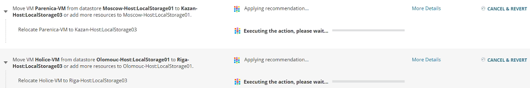 The Recommendation engine reviews the recommendations and places them in an execution order based on prerequisites per recommendation. A compilation of actions displays in an info box, such as the message for 2 VMs powering off in the following screenshot.