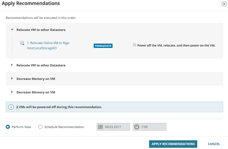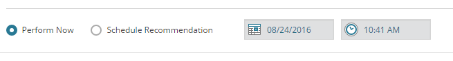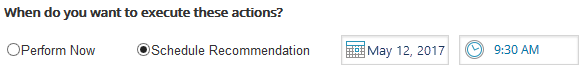Select to run the recommendations immediately or schedule the actions for a specific time and date, such as outside of peak or business hours. This time will run all recommendations in the list. Perform Now immediately runs the recommendation.   Scheduled recommendations run according to the selected date and time you enter.