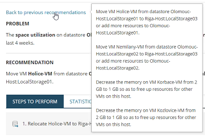 To view a specific recommendation in the list, click the linked name. This opens a view into the recommendation. In the Steps to Perform tab, you can read over the issue, risk description, and resolution. Check the details of the steps how the action will be executed. If the VM does not support live changes, applying a recommended action should involve shutting the VM down, and then starting it again. Select Power off the VM to turn the VM off while the recommended action is executed and have it turned on again when the action is finished.   In the Statistics tab, review the projects affects of the changes.