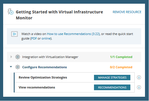 - Configure the recommendations settings from the Getting Started resource on the Virtualization Summary page in the SolarWinds Platform Web Console. Click Manage Strategies.