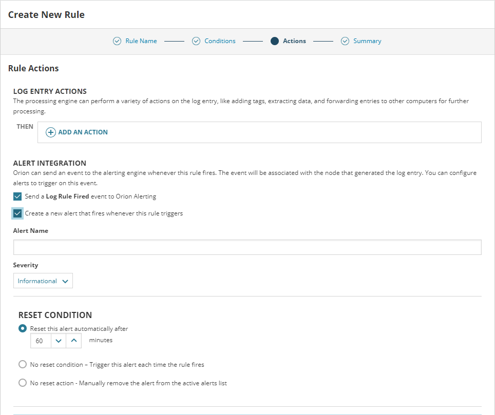 - On the Actions tab, check the box for Send a Log Rule Fired event to Orion Alerting