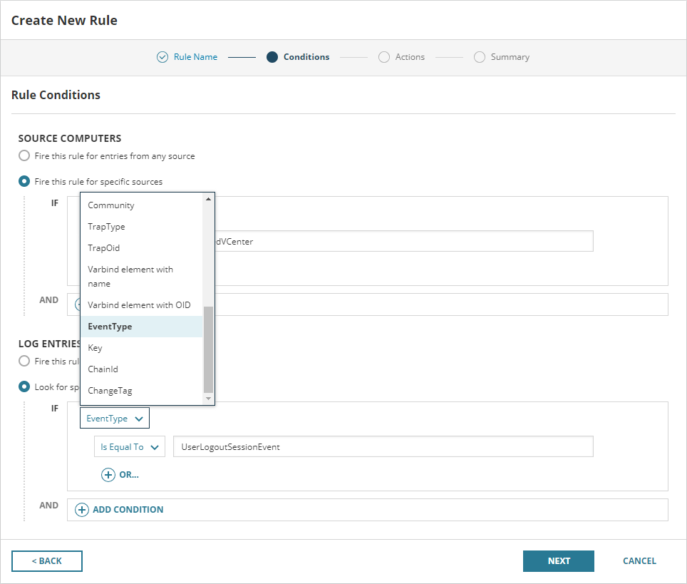 Here's an example for setting up a trigger based on a VMware Event's EventType. In this example, we'll create an alert to trigger for VMware Events of EventType "UserLogoutSessionEvent".