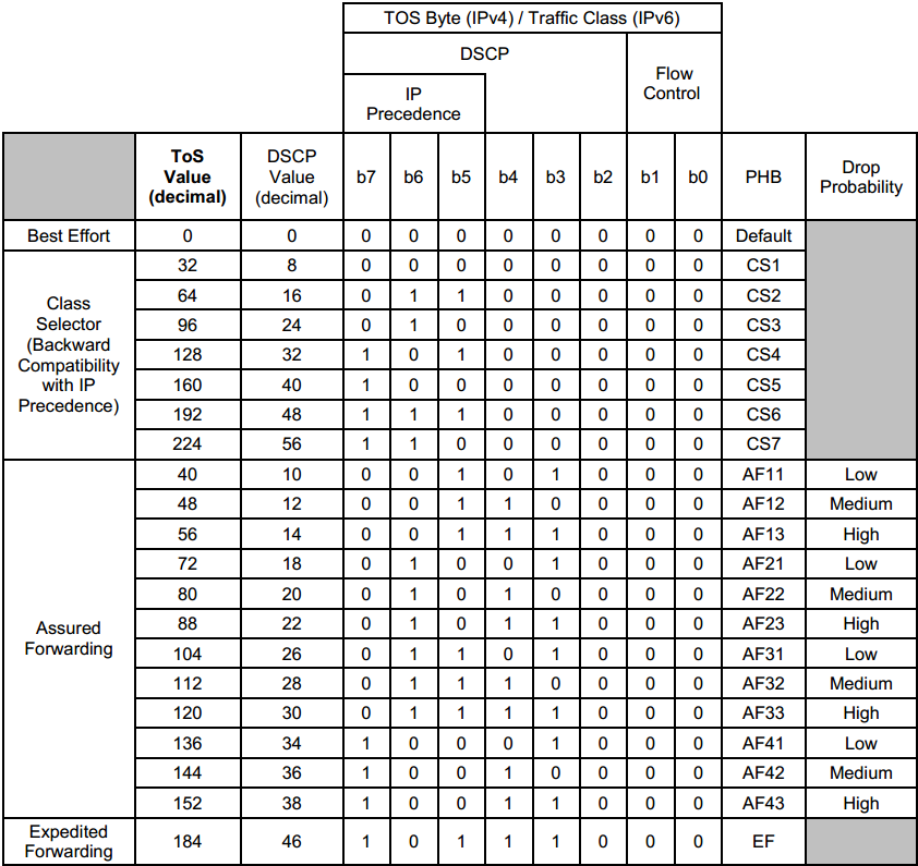 The Type of Service value used by VoIP and Network Quality Manager corresponds to the per hop behavior (PHB) and the Differentiated Service Code Point (DSCP) values as shown in the following table: