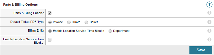 The Parts & Billing Options enable or disable the parts and billing functionality, define the ticket PDF format, and enable or disable service time blocks by location. This functionality is enabled by default.