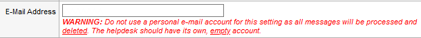 In the email Address field, enter the email address used by WHD to receive WHD requests.   To prevent WHD from sending nonstop ticket updates, use a real email address. Do not use an alias.