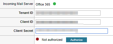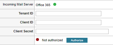 For Authentication Mode, select OAuth.   The Incoming Mail Server row displays the Microsoft Office 365 option with three additional fields.   Field Description Tenant ID The ID number linked to your domain (such as solarwinds.com). Client ID The ID number that is unique for each registered Azure application (such as WHD). Client Secret The encrypted password generated by Azure.