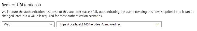 Under Redirect URI (optional), create a redirect URI in the following format using the WHD server DNS name and port number you retrieved in a previous step: https://<Server_DNS_Name>:<Port>/helpdesk/oauth-redirectFor example: https://localhost:8443/helpdesk/oauth-redirect